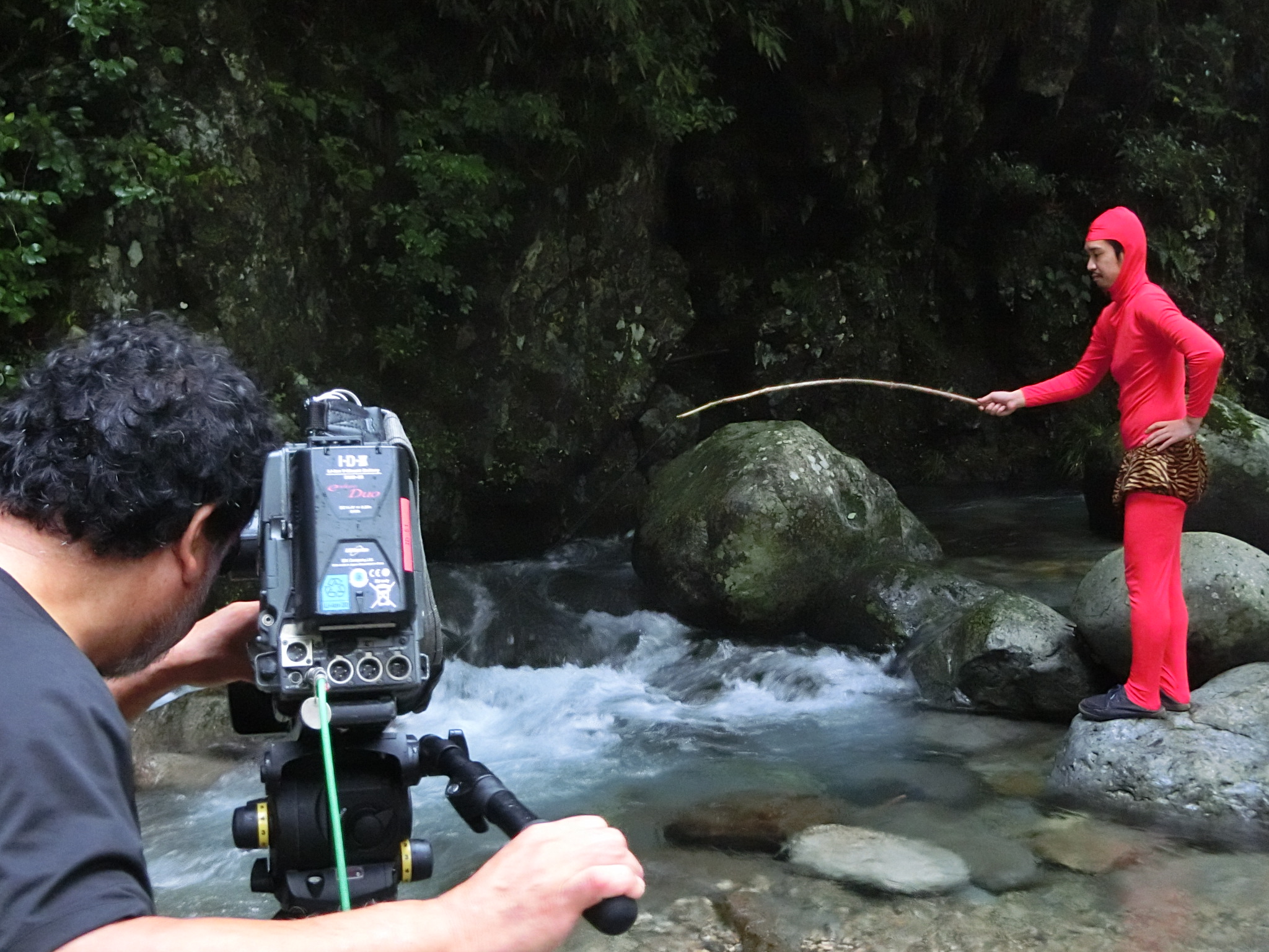 下の写真は、担当してる名古屋テレビの朝の情報番組「ドデスカ!」のロケでの一コマ。オニに扮したADくんがウナギの人形に糸をつけて川を泳がせています。彼はこの後オニとして里で暴れるのです。この光景、ロケあるあるですね!