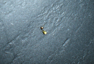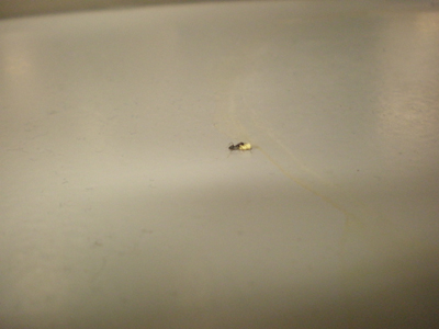 アリが頭に小さな白い物体(アリコロリに入っている毒)を乗せて、