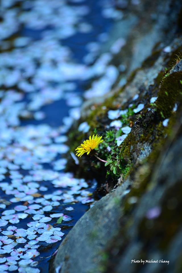 赤い中橋の下で撮ったタンポポと散った花びら。
